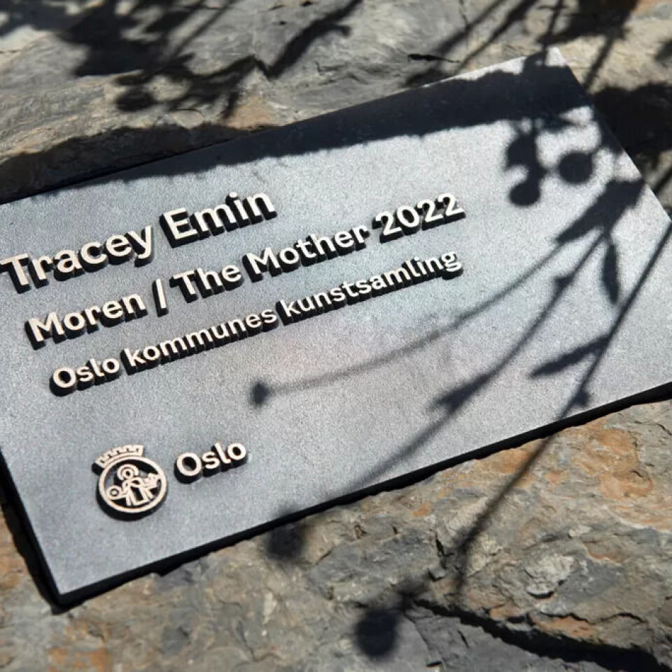 Eg går nærare skulpturen, som er langt mindre enn den ni meter høge «Moren» i Oslo, men likevel nesten dobbelt så høg som meg. Ein plakett stoppar meg. Der står mellom anna namnet på den britiske kunstnaren, «Tracey Emin», og «The Mother, 2017».