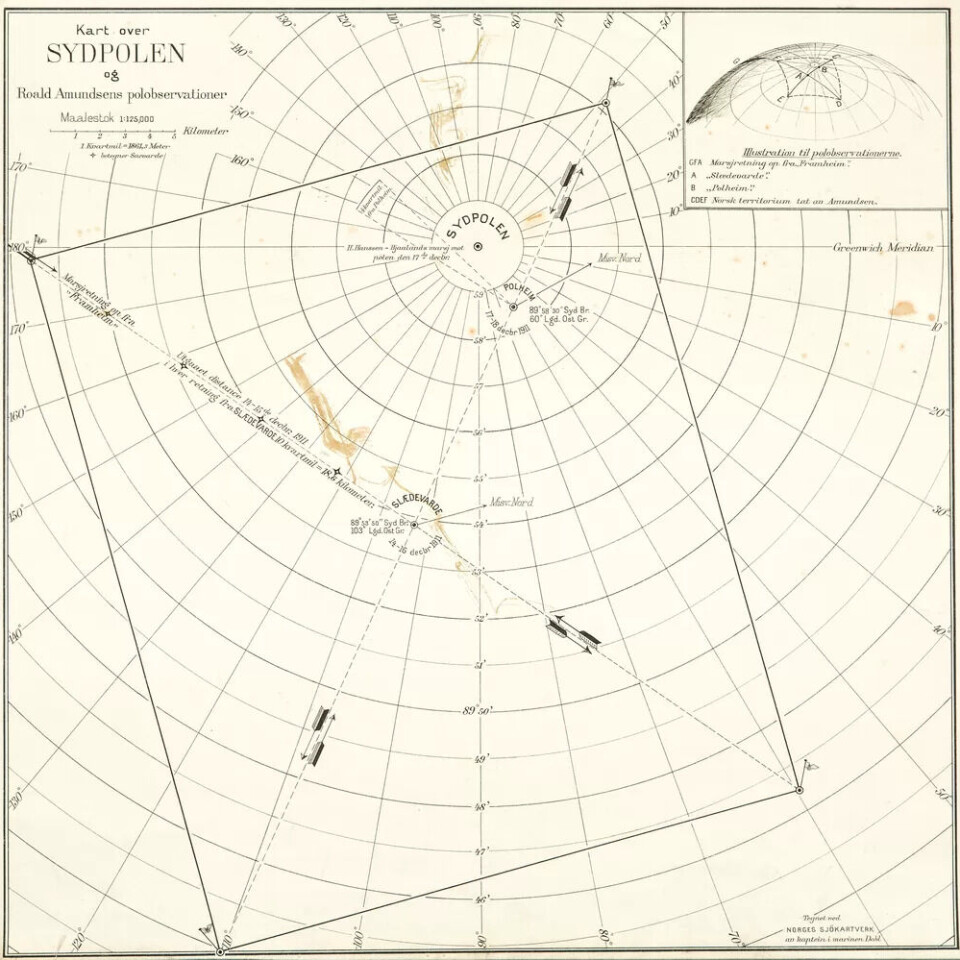 Men kvar var dei eigentleg denne dagen? Hadde dei kome fram til Sørpolen? Eller «Sudpolen», for å nytte skriveforma til Olav Bjaaland – som noterte følgjande: «Sudpolen rak me 1/2 3 i dag. Trøyte og soltne. Gud skje tak for me naa hev mat nok for tilbaketuren.» Før han la til: «Her er slet som paa Morgedalskjønni og godt skiføre.»
