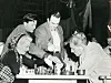Skodespelarane Lana Turner og Spencer Tracy får instruksar av sjakkekspert Herman Steiner (til venstre) og regissør George Sidney.