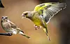 Om vinteren vitjar frøetaren grønfink gjerne matarar. Biletet syner skilnaden i fjørdrakt mellom hoe (t.v.) og hanne (t.h.).