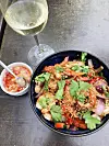 Denne salaten med reker er ganske mild. Han vert fyrigare om du har i sausen som står ved sida av.