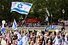 Propalestinske demonstrantar heldt motdemonstrasjon då organisasjonen Med Israel For Fred (MIFF) arrangerte ei markering av sjølvstendedagen til Israel utenfor Stortinget i mai 2025.