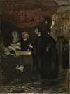 Eilif Peterssen «Erik Valkendorf møter Sigbrit Willums og Dyveke på Bergens torv i 1507», olje på treplate, 1876.
