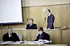 Sjukeheimsstyrar Arnfinn Nesset under første dag i rettssaka i Frostating lagmannsrett, 18. oktober 1982. Nesset står bak til høgre. Forsvararane hans sit framføre han; Alf Nordhus t.v. og Morten Gunnes.