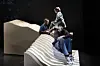 Skodespelarane er i stadig rørsle på dei sceniske elementa.