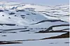 Litlos turisthytte, midt i biletet, 3. juli 2015. Både villrein og fotturistar skyr Vestvidda når det er så mykje snø tidleg på sommaren, og slike somrar har det vore mange av dei siste tiåra.