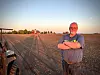 Richard Timmons på den nysådde maisåkeren på storgarden utanfor Stavanger i Illinois. Løa i bakgrunnen er ikkje løe, men eit privat museum og siloen er gjestehus.