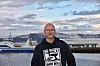 Eg fotograferer Hauksson på bryggja. Står han på venstre side, vil bakgrunnen vise fiskeriverksemda i Reykjavík. Ytst i vika ligg hovudkontoret til eit av landets største fiskeri- og sjømatselskap, Brim, og to store trålarar.