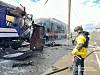 Eit bomba tog på stasjonen Sjostka i Sumy-regionen i Ukraina 4. oktober 2025. Russland har trappa opp åtaka på toga og må ha gitt opp å ta over dei ukrainske jernbanene, fortel Andrej Kurkov.