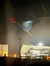 Brann i sarkofagen over atomreaktoren som eksploderte i Tsjernobyl i 1986. Sarkofagen vart råka av ein russisk drone 14. februar i år, melder ukrainske styresmakter. Foto: IAEA / NTBIAEA