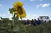 Ein gjeng solsikkeinnhaustarar tar ein pause i ein åker i Aust-Ukraina. Ettersom byane blir bomba, flyttar fleire og fleire til fråflytta små stader, der dei truleg blir verande.