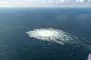Gass strøymer til overflata frå dei sprengde Nord Stream-leidningane på botnen ved den danske øya 27. september 2022.