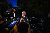 eit fulltalig og morgontrøytt pressekorps utanfor heimen til ein finansminister