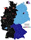 Kart over kva parti som vart størst i kvar valkrins. Svart og mørkeblå syner Kristelegdemokratane, lyseblå syner AfD. Venstresida (raudt, rosa og grønt) er berre størst i byane.Foto via Wikimedia Commons