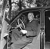 Statsminister Einar Gerhardsen i 1956 bak rattet til bilen av merket Pobeda GAZ-12 ZIM, med drygt 90 hestekrefter, som han fekk i gåve under ei vitjing i Sovjet året før.