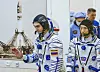 Roskosmos-kosmonaut Oleksij Zubritskyj (til venstre) og Nasa-astronaut Jonny Kim får sjekka draktene i Bajkonur kosmodrom i Kazakhstan like før dei vert skotne opp til den internasjonale romstasjonen (ISS) 8. april.